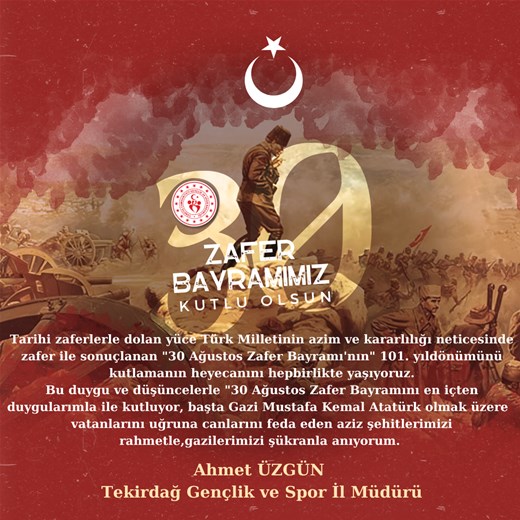 GENÇLİK VE SPOR İL MÜDÜRÜMÜZ AHMET ÜZGÜN'ÜN "30 AĞUSTOS ZAFER BAYRAMI'NIN" 101. YILDÖNÜMÜ İLE İLGİLİ MESAJI