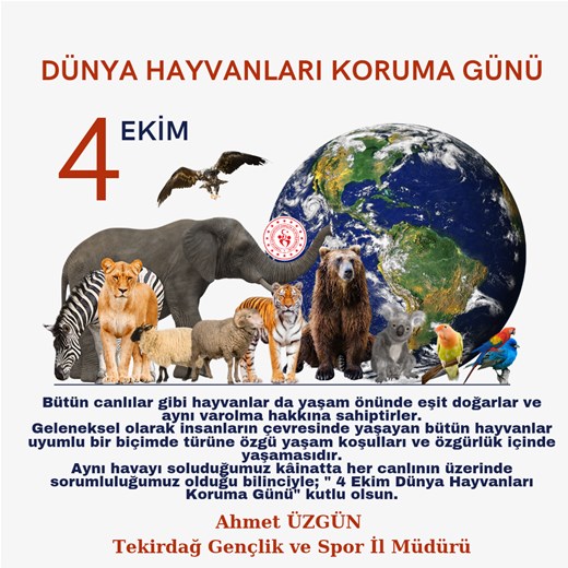 GENÇLİK VE SPOR İL MÜDÜRÜMÜZ AHMET ÜZGÜN'ÜN"4 EKİM DÜNYA HAYVANLARI KORUMA GÜNÜ"İLE İLGİLİ MESAJI...