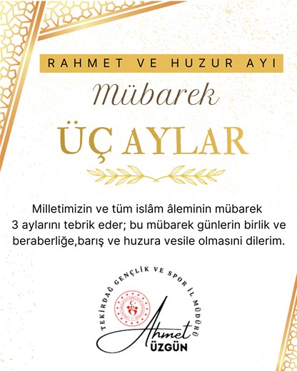 GENÇLİK VE SPOR İL MÜDÜRÜMÜZ AHMET ÜZGÜN'DEN "MÜBAREK 3 AYLARIN BAŞLANGICI" DOLAYISIYLA YAYINLADIĞI MESAJ...