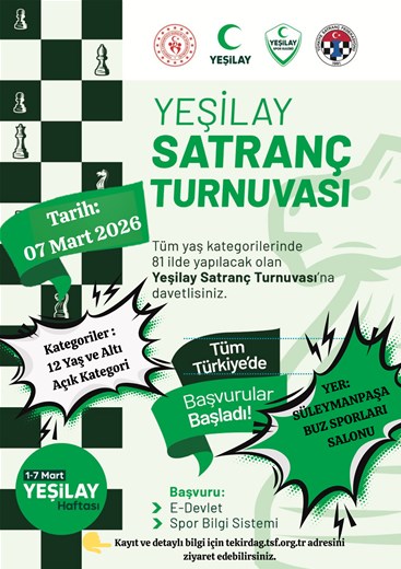 Gençlik ve Spor Bakanlığımızın Ulusal Proje takvimi kapsamında yurt genelinde olduğu gibi ilimizde de kutlanan ''Yeşilay Haftasında'' Türkiye Yeşilay Cemiyeti ve Yeşilay Spor Kulübü ile birlikte 7'den 77'ye tüm vatandaşlarımızın katılımı ile 07 Mart 2026 tarihinde Süleymanpaşa Buz Sporları Salonunda ''Yeşilay Satranç Turnuvası'' düzenlenecektir.